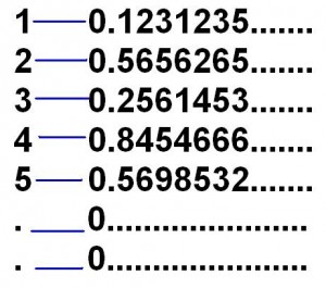 لنفرض أن شخصا أدعى انة يمكن ان نقارن كل رقم طبيعي بكل رقم عشري غير منتهى و اعطانا كمثال الشكل التالى