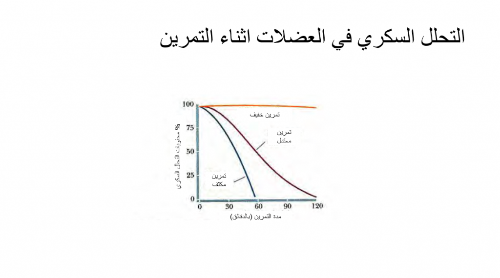 اما التحلل السكري في العضلات فيكون بأقوى حالاته في التمارين الخفيفة, بينما يكون اقل في التمارين عالية الكثافة. ونقصد بالكثافة هنا ما يحدد بواسطة نبض القلب ومعدل التنفس بحيث يتجاوز حد الـ 60% من الحد الاقصى لنبض القلب للشخص وهي معدلات ثابتة بحسب العمر.